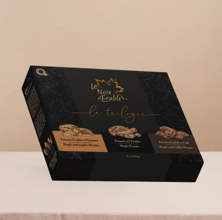 La boîte Trilogie réunit trois créations artisanales d’exception, pour une expérience gourmande complète autour de la pacane et de l’érable.